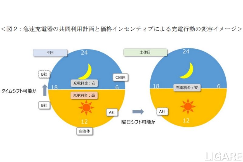 今回の実証実験では、日産リーフと、同社のカーシェアリングサービス・NISSAN e-シェアモビを利用。これらを使い、車両の利用状況データ等を取得する。共同利用する急速充電器は、東京電力パワーグリッドの山梨総支社櫛形事務所に1台設置。予約制の充電スケジュールで参加企業・団体が共同利用し、車両走行や充電量・充電時間に関するデータを取得する。時間帯別の充電料金を導入することで、価格インセンティブによる充電行動の変容なども観測し、実効性・経済性の検証を行う。