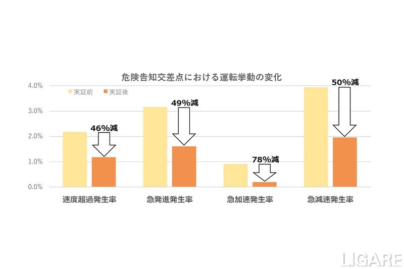 具体的には、矢崎総業が開発した車載タブレット用アプリケーションの活用とインセンティブの供与等により、ユーザーの行動の変化が確認できた。危険度が高い8カ所の交差点においては、接近時に警告を行い、実証前と比較して速度超過46%、急発進49%、急加速78%、急減速50%の発生頻度の減少を確認した。また、安全運転度に合わせてキャラクターの表情が変化するアプリにより、ピーク速度減少等の効果につながったという。