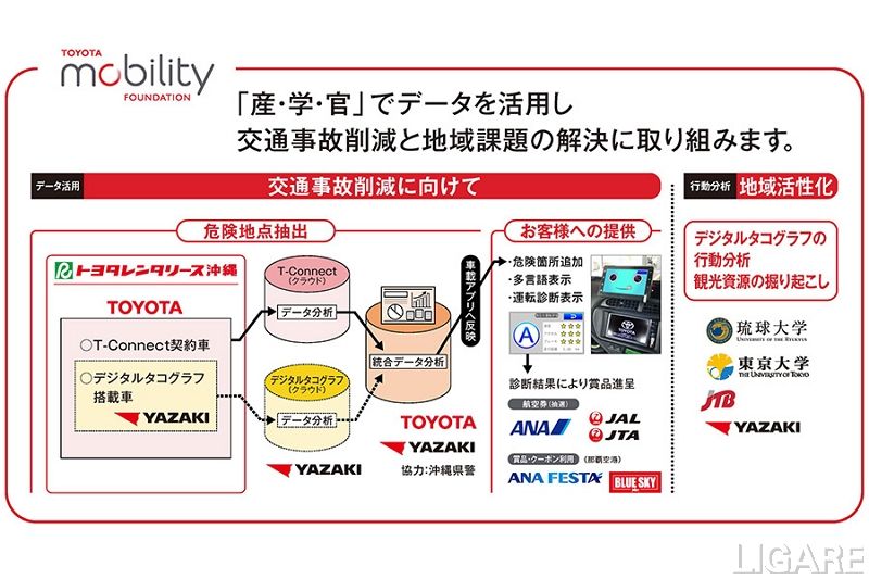 TMFは、矢崎総業株式会社(以下、矢崎総業)、株式会社トヨタレンタリース沖縄、株式会社JTBとともに、レンタカー利用者の安全運転支援のための実証実験を実施してきた。その結果、事故多発地点での危険挙動の削減や速度の抑制など、交通事故削減につながるユーザーの行動変化を確認している。