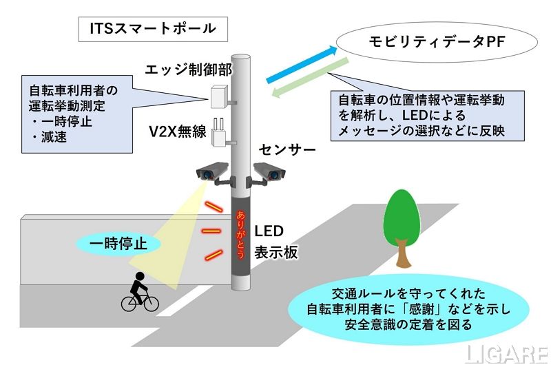 今回の取り組みでは、インフラ協調型危険回避システム「ITSスマートポール」を活用した実証実験、ブリヂストンサイクル株式会社による自転車利用者への安全意識向上活動を行う。インフラ協調型危険回避システム「ITSスマートポール」を活用した実証実験では、支柱に取り付けたカメラやセンサーで自転車やクルマの動きを感知し、LEDディスプレイ等を使って自転車利用者や自動車ドライバーに情報を表示するシステムを活用し、信号のない交差点において出会い頭事故の未然防止効果等を検証する。ITSスマートポールを活用したポジティブなメッセージの表示によって自転車利用者の一時停止ルールの定着を図る取り組みは、全国初の試みだ。