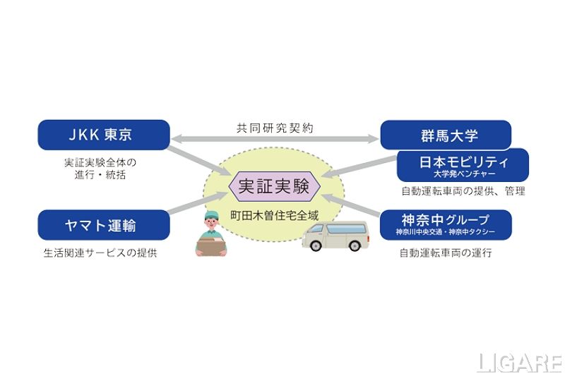 実証実験には、JKK、群馬大学以外にも、日本モビリティ株式会社(以下、日本モビリティ)やヤマト運輸株式会社(以下、ヤマト運輸)が協力する。JKKは、実験全体の進行統括を担当。群馬大学及び日本モビリティは、自動運転車両を提供・管理する。ヤマト運輸は、外出を支援する生活関連サービスを提供する予定だ。また、町田木曽地域の地元交通事業者である神奈中グループの協力により、自動運転車両を運行する。なお、実験にかかる事業費の一部は、東京都が負担するという。