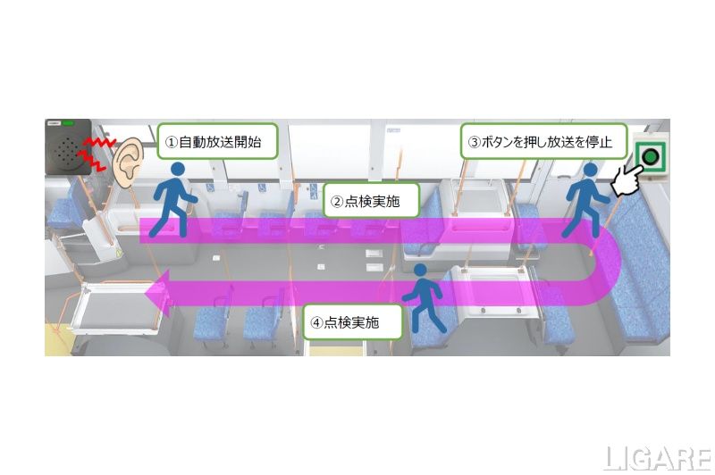 システム導入後の車内点検の手順としては、まず車内点検を促す音声が自動的に流れる。次に乗務員が車内点検を行いながら最後部まで移動、最後部にあるボタンを押して音声を停止させる。その後、車内点検を行いながら運転席に戻るという流れだ。