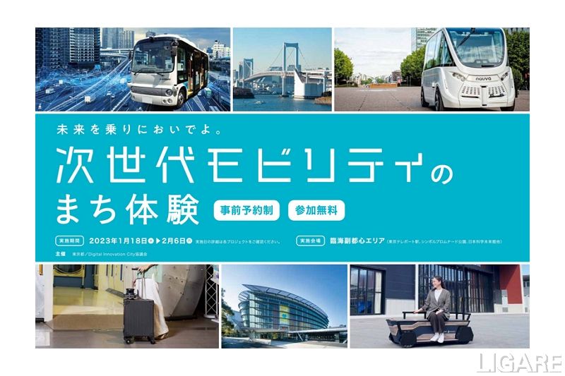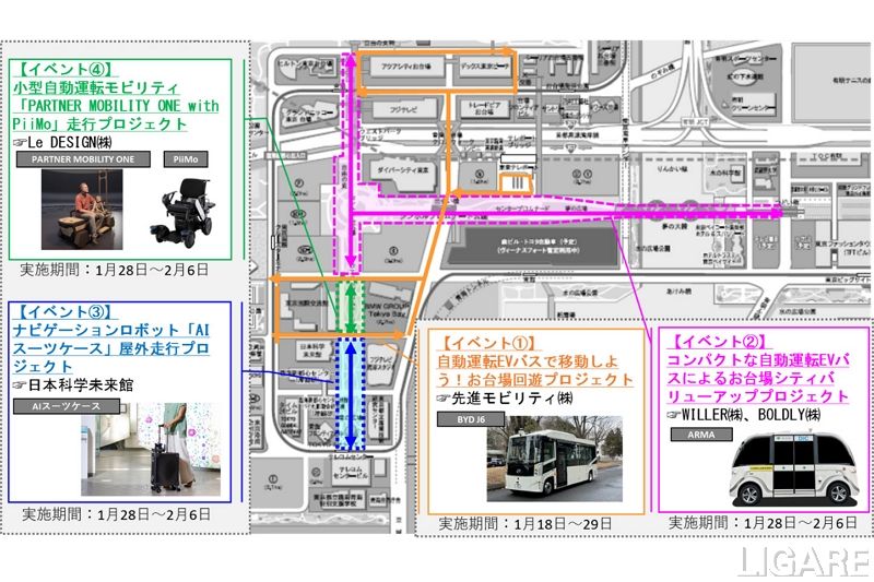 同イベントは、先進モビリティ株式会社、WILLER株式会社、BOLDLY株式会社、日本科学未来館、Le DESIGN株式会社と協働し、関連団体が研究開発を進めるものだ。東京臨海副都心 公道、およびシンボルプロムナード公園内で2023年1月18日~2月6日に実施する。