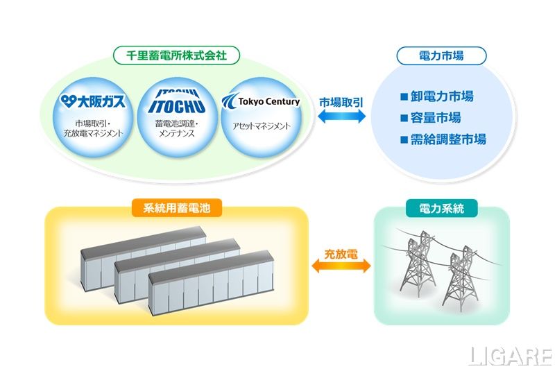 伊藤忠商事株式会社は、大阪ガス株式会社(以下、大阪ガス)と東京センチュリーと合弁で千里蓄電所株式会社を設立し、大阪府吹田市で蓄電所事業を開始する。