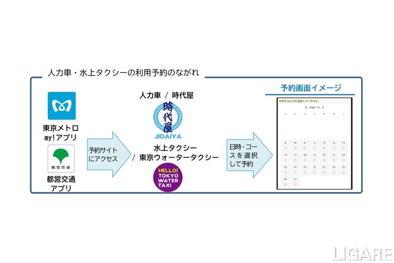 同サービスは、東京の地下鉄サービス一体化の取り組みの一環として実施する。両社局の公式アプリ(東京メトロmy!アプリ、および都営交通アプリ)を介して、人力車・水上タクシーの遊覧コースを格安な料金で予約することが可能だ。