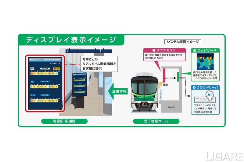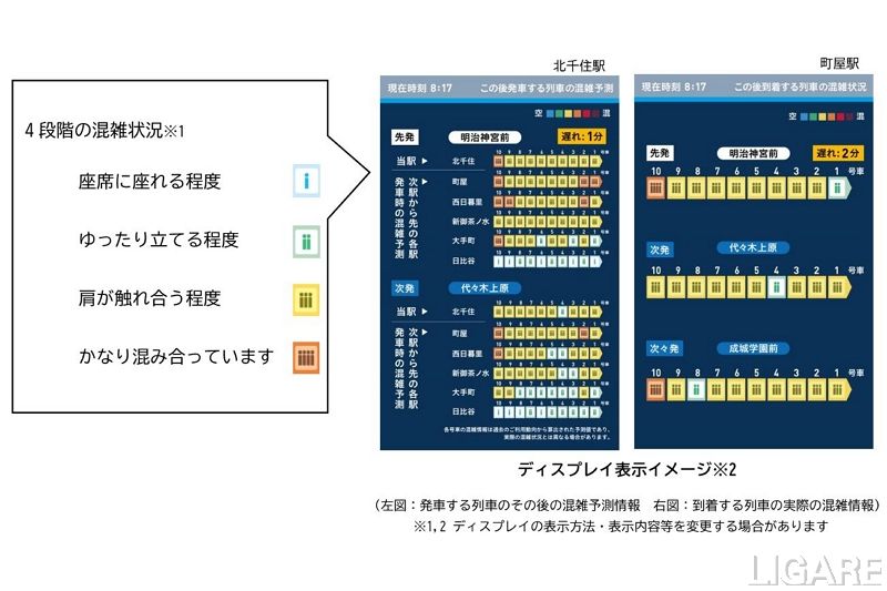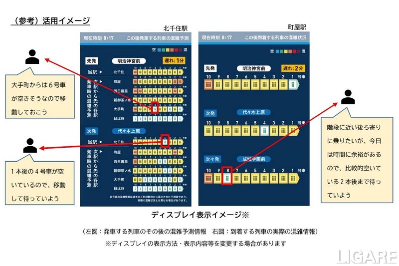 今回の取り組みでは、北千住駅に設置したデプスカメラで、リアルタイムに実測した号車ごとの混雑情報を基に、北千住駅コンコースでは、「乗車後の各駅の混雑予測」を2024年12月16日から、町屋駅コンコースでは、「到着する列車の実際の混雑」を2025年1月中旬からそれぞれをディスプレイに表示する。これらにより、千代田線の同駅から代々木上原方面行の利用者は、ディスプレイの表示をもとに、空いている号車を選択することが可能となる。