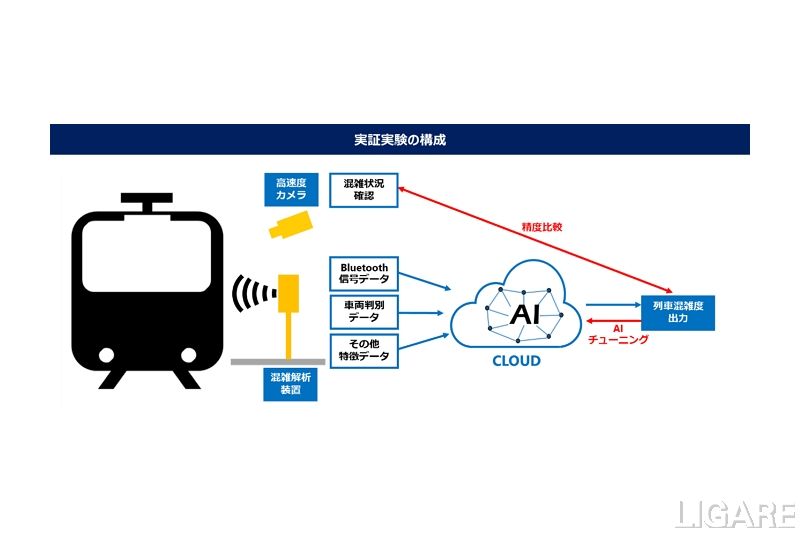 具体的には、田園都市線駒沢大学駅の上り(渋谷方面)ホームに混雑解析装置と高速度カメラを各1台設置する。列車に乗車しているユーザーが持つスマートフォンのブルートゥース信号を、駅に設置した「混雑解析装置」で取得。これらのデータをクラウド上のAIにて混雑状況を解析する。さらに、AIの解析精度を高めるため、高速度カメラで撮影・測定した混雑状況なども組み合わせて、AIのチューニングを行う。