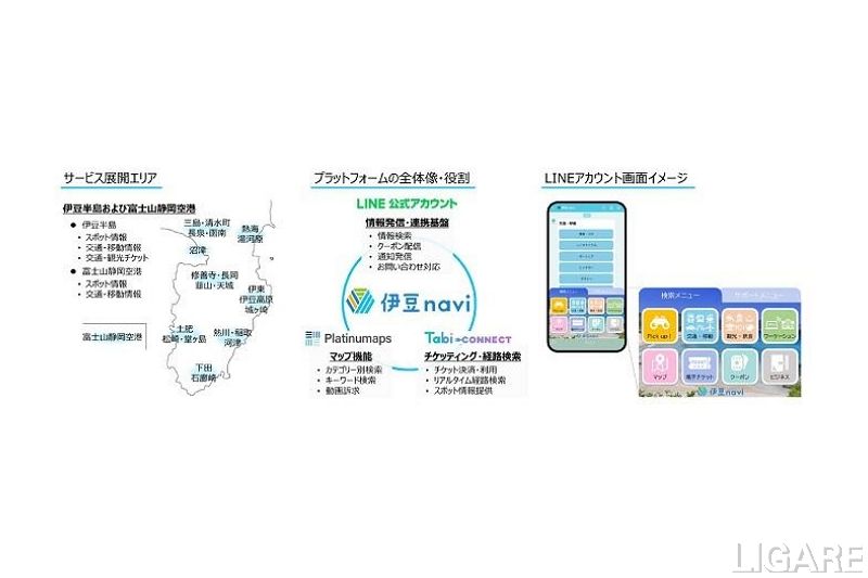 そこで、同社は、「伊豆navi」の展開にあたり、「LINE」、「Tabi-CONNECT」、「プラチナマップ」を組み合わせた。「Tabi-CONNECT」はJR東日本が提供する地域・観光型MaaSパッケージ、「プラチナマップ」はボールドライト株式会社が提供するデジタルマッププラットフォームだ。