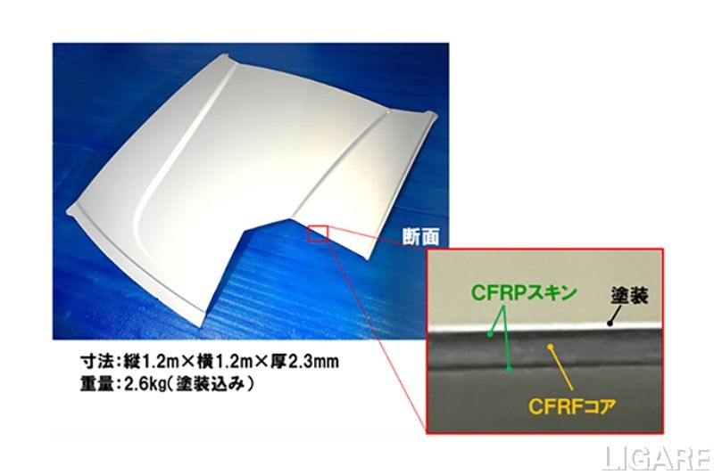 同技術は、軽量な炭素繊維多孔質材料(以下、CFRF「Carbon Fiber Reinforced Foam」※1)をコア材とし、力学特性に優れる熱硬化性プリプレグ※2をスキン材としたものだ。今回の成果の一部は、国立研究開発法人新エネルギー・産業技術総合開発機構(NEDO)の委託業務「革新的新構造材料等研究開発」の結果得られている。
