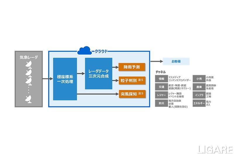 同サービスでは、公共の気象レーダのデータを解析するため、気象レーダなどのハードウエアをユーザーが維持・運用することなく、高度なデータ解析により生成される気象データを利用することが可能だ。鉄道、道路、航空などの公共交通事業や、建設業やエネルギー業などのインフラ事業者、自治体や医療機関、民間気象事業者への提供を想定しているという。
