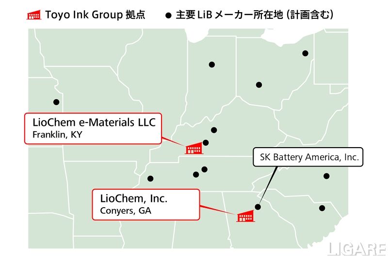 東洋インキグループのリチウムイオン電池正極材用導電CNT分散体LIOACCUMは、2021年、SKオンに採用され、米国ではライオケム株式会社(ジョージア州)から製品供給を行ってきた。しかし、北米エリアでの急激な需要増加に伴い生産能力が不足する見込みだ。そこで、リチウムイオン電池関連材料事業のパートナーである稲畑産業株式会社と、2023年1月、ライオケム・イー・マテリアルズ合同会社を設立した。2025年の量産開始を予定し、段階的に米国でのリチウムイオン電池正極材用導電CNT分散体の生産能力を現行の4倍まで引き上げることを計画している。