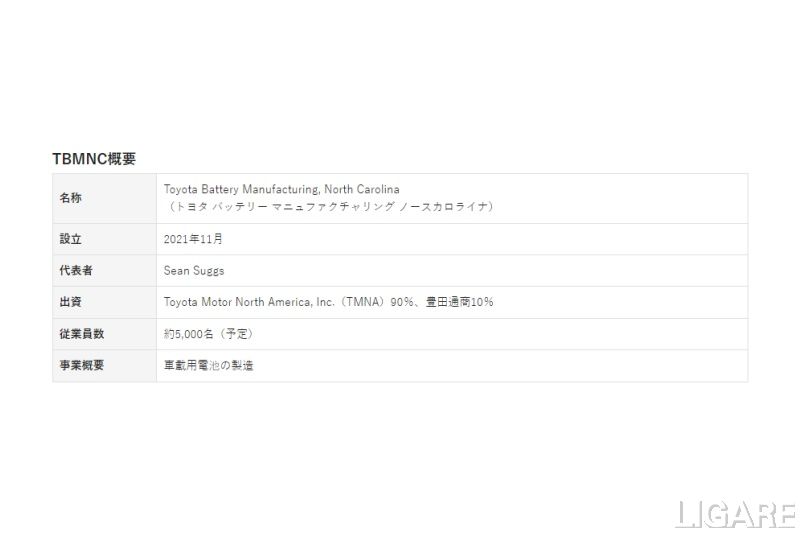 TBMNCは、米国では11か所目の生産事業体であり、HEV、PHEV、BEVの電池をトヨタが米国で初めて生産する電池工場となる。投資額にして約140億ドル、約5000人の雇用を計画しており、これまでの実績と合わせると、米国において累計で約490億ドルを投資し、約28万人の雇用を創出することになる。