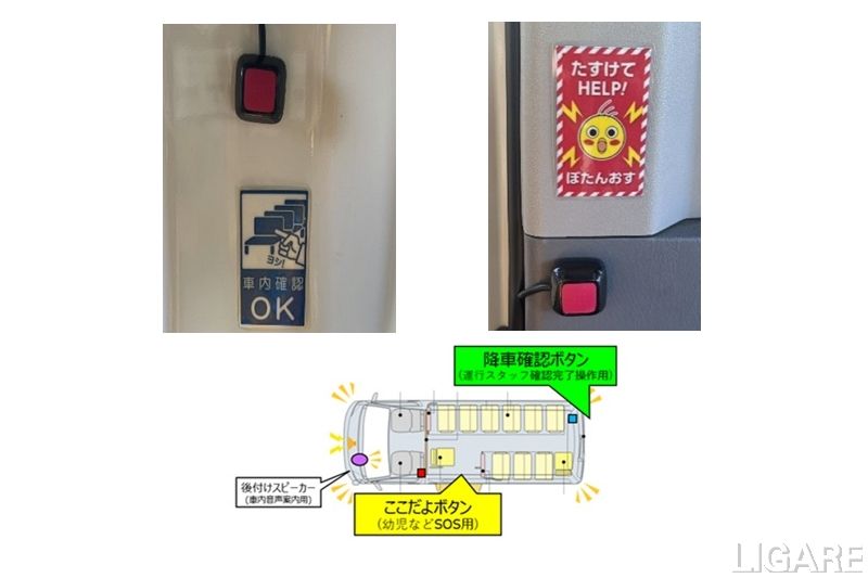 同商品では、運行スタッフへ確認を促す音声案内と確認未実施時の車外警報(降車確認ボタン)と、幼児など置き去り発生時車外警報(ここだよボタン)を搭載している。降車確認ボタンでは、エンジン停止(IG/ACC OFF)後に、運行スタッフに車内の確認を促す音声案内を開始する。運行スタッフが車内に残っている幼児などがいないか確認し、車内最後尾に設置した降車確認ボタンを押すと音声案内は停止するという仕組みだ。音声案内開始から一定時間経過しても降車確認ボタンが押されない場合、ホーンの吹鳴とハザードランプの点滅で車外へ警報する。