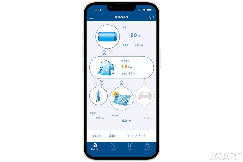 さらに、「おうち給電システム」は、電動車(HEV・PHEV・BEV・FCEV)のAC100V出力からの給電に対応しており、停電時に家庭のバックアップ電源として、電動車に蓄えた電気が使うことが可能だ。ほかにも、スマートフォンやタブレット端末にダウンロードした専用アプリから、蓄電量の確認、運転モード設定などをリアルタイムで操作することができる。
