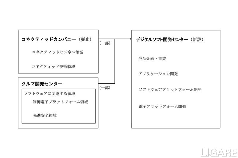 今回の組織変更では、クルマ開発センターの一部、コネクティッドカンパニーの一部を集約し、デジタルソフト開発センターを新設する。一方、コネクティッドカンパニーは廃止するという。