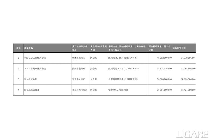 今回の公募では、本田技研工業株式会社(以下、ホンダ)、トヨタ自動車株式会社(以下、トヨタ)、東レ株式会社(以下、東レ)、旭化成株式会社(以下、旭化成)の4社の事業が採択されている。ホンダは燃料電池と燃料電池システム、トヨタは燃料電池スタックとモジュール、東レは水電解装置部素材(電解質膜)、旭化成は電解セル、電解用膜を事業とするとのことだ。
