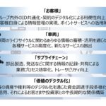 (1)「お客さま」を軸に、グループ内外のID共通化・契約のデジタル化による利便性向上、お客様自身による情報管理の実現、ポイントサービスへの活用等(2)「車両」のライフサイクルに関わるあらゆる情報の蓄積・活用を通じた、各種サービスの高度化、新たなサービスの創出