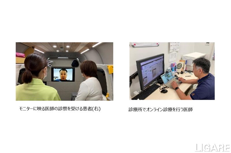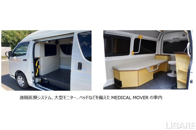 また、同車両には、診察に必要となるベッドやキャビネットデスク、乗降ステップ・手すりなどの基本装備のほか、遠隔診療システムや大型モニターなどを搭載。患者は車内にいる看護師のサポートにより、医師のオンライン診療を受け、患者・医師双方が移動することなく医療サービスを届けることができる。さらに、通常の診察や健康相談のほか、災害時には被災者のケアなどに利用可能だ。