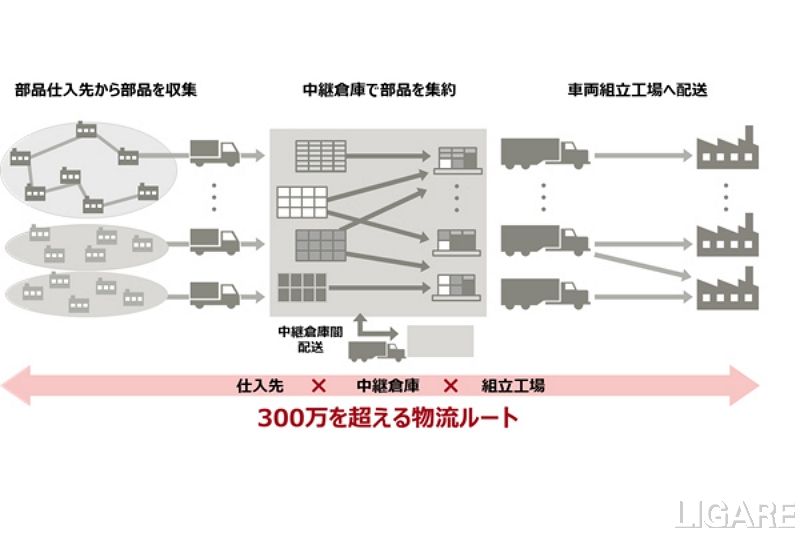 今回の実証では、自動車製造に必要な部品の物流ネットワークを最適化について検証した。仕入れ先から部品を仕入れ、中継倉庫を通り、組み立て工場へ配送する300万以上のルート候補に対して、「デジタルアニーラ」で物流コストの最適化計算を行った。この最適化には、トラックの台数、総走行距離、仕分け作業なども含まれている。