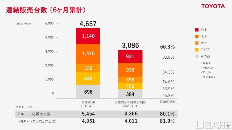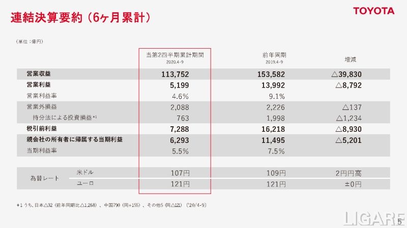 [画像:6カ月(4-9月)累計の連結販売台数と連結決算要約 トヨタ 2021年3月期 第2四半期決算資料より]