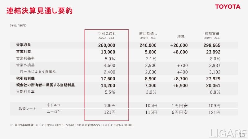 当初発表していた2021年3月期の期首予想では、年間で営業利益5,000億円を見込んでいたが、この半年でその予想を既に達成したことになる。そのため、トヨタは年間の業績予想を大幅に上方修正し、1兆3,000億円の営業利益へと見通しを改めた。