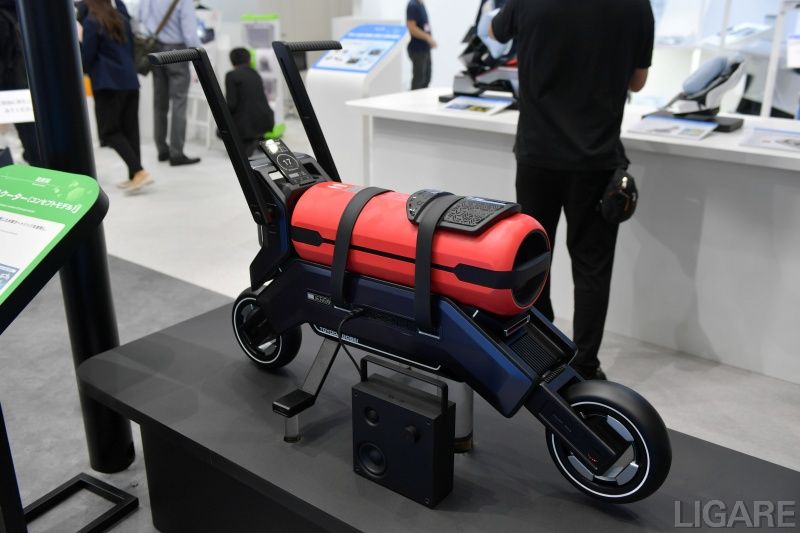 水素カートリッジの扱いやすさを補完するため、豊田合成は専用スタンドと水素スクーターも併せて展示した。スタンドは今回、展示用の試作モデルであり、今後は充填機能を備える計画だ。現時点で国内の水素ステーションは限られており、利用環境の整備が課題とされている。こうした背景を踏まえ、持ち運び型カートリッジとスタンドによる充填システムは、充填時間の節約からも注目されるはずだ。