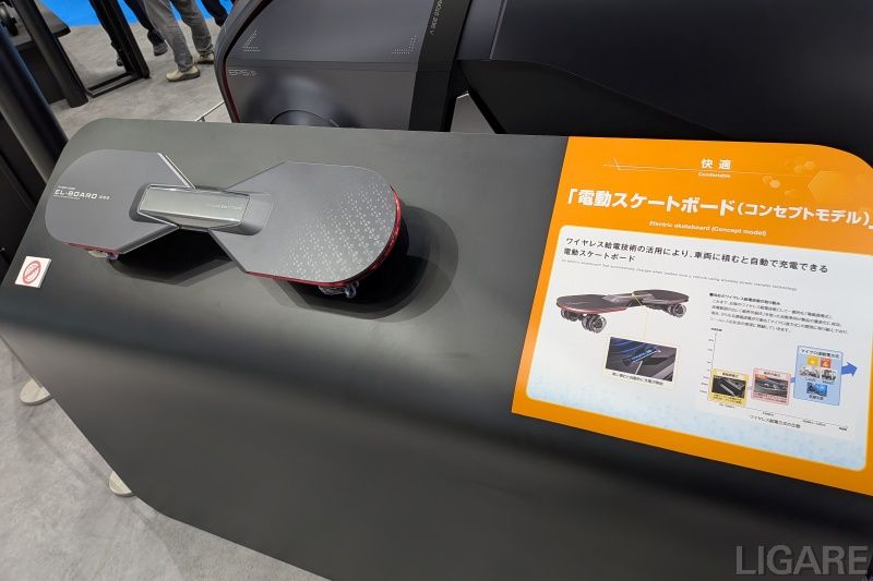 水素カートリッジはモビリティ用途にとどまらず、家庭用電源や調理器など日常生活への応用も想定されている。 1つの応用例が、同社ブースで展示した電動スケートボードだ。このコンセプトモビリティは、ワイヤレス給電技術を採用し、FLESBY HY-CONCEPTに装着することで自動充電を行う仕組みだ。特筆すべきは、カートリッジ装填とワイヤレス給電の双方を展示した点だ。水素スクーターでは、カートリッジを支える構造が必要となるため、小型家電などへの搭載は難しい。しかし、この電動スケートボードは、燃料電池車をいわば充電インフラと見立てることで、小型電気製品でも水素エネルギーを活用できる可能性を示した。新たなエネルギー利用の選択肢を提示した展示といえる。