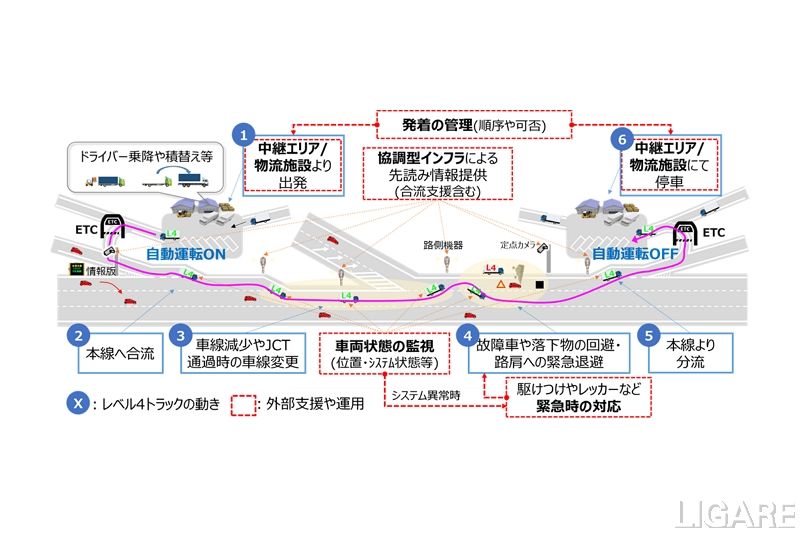 今回の実証では、新東名高速道路の駿河湾沼津サービスエリア~浜松サービスエリア間において、自動運転を社会実装する際に必要となる、複数の機能の確認や検証を個別に行う。具体的には、出発・到着地点において自動で発車・駐車を行う自動発着システムや、緊急時に停止するための制動機能をはじめ、道路周辺に設置されているITSスポット※などの路側機器から発信される故障車や落下物情報等の有用性、走行時の遠隔監視機能などを確認・検証していく予定だ。