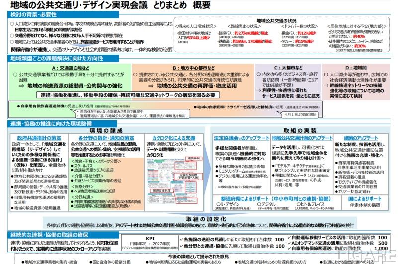 これら地域交通の再設計に向けて27年度までの数値目標を設定。進捗を定期的に検証するという。数値目標は「各施設の送迎の見直しに新たに取り組む自治体100団体」「自家用有償旅客運送(交通空白地有償)に取り組む団体1000団体」「他分野との連携・協働に先導して取り組む自治体100団体」など。
