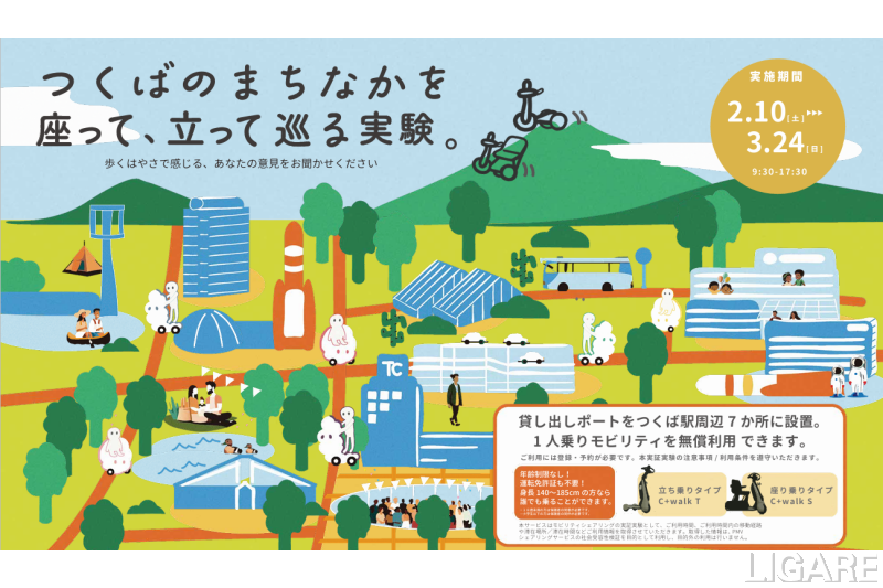 つくば駅周辺の7か所で貸出ポートを設置しており、2月10日から3月24日まで無償で利用できる。