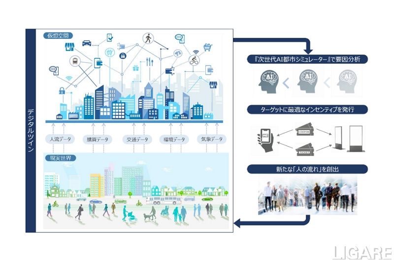 仮想空間に現実世界を再現するデジタルツインを活用して、デジタル空間上に小田急線海老名駅と周辺エリアを再現し、人流・交通・購買・来訪者の属性などのデータを使って、人々の流れや行動を可視化・予測するシミュレーションを行う。これに基づき、実際に、来訪者のスマートフォンアプリへの各種情報の通知やクーポンの発行、施設内のデジタルサイネージでの情報表示などを実施することで、人々の行動変容を促し、混雑緩和と購買促進の両立、交通の最適化、災害時の避難誘導などに関わる技術を開発し、社会実装を目指すという。