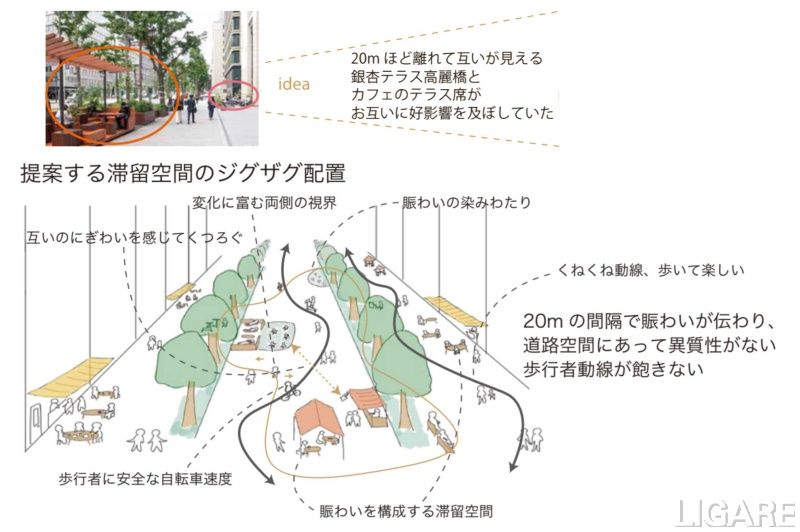 同実証の目的は、20m程度の間隔でファニチャーを配置することが滞留空間同士に好影響を及ぼすこと、さらにそれらをジグザグ配置することで街路景観の中に溶け込み、自然と通行者の移動速度も落ちるという仮説を、通行の安全性にも配慮して立証することだ。9月25日夕方以降に直線配置からジグザグ配置に置き換えられ、配置の違いによる利用の変化を捉える。さらに、アンケート調査やAIカメラ等による検証を行うことも予定しているという。