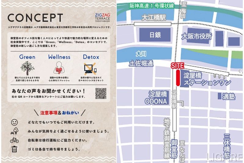東京大学大学院都市デザイン研究室は9月22日、滞在空間配置の社会実験「ジグザグテラス淀屋橋」を大阪・御堂筋の歩道上で9月22日~28日に実施すると発表した。