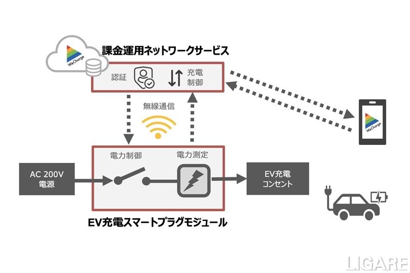 さらに、オムロンは、個々の充電器に後付け設置が簡単でかつ、電気使用量を測定できるモジュールを開発する。このモジュールをEV充電コンセント内に設置し、「WeCharge」と連携することで、利用ユーザーごとの充電料金を算出するサービスを充電器1基から実現するという。