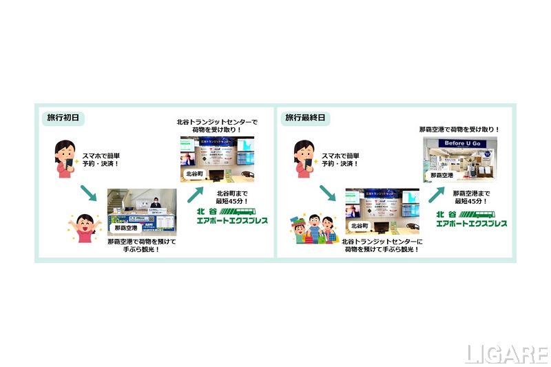 同事業では、北谷観光MaaSプロジェクトの一環として、北谷トランジットセンターにAirporterの市中型集配拠点を開設する。これにより、那覇空港の北谷観光MaaSカウンターにて手荷物を預けると北谷町まで運ばれ、北谷トランジットセンターで受け取ることが可能だ。また、北谷トランジットセンターにて手荷物を預けると、手荷物は那覇空港まで運ばれ、「Before U Go」カウンターで受け取ることができる。