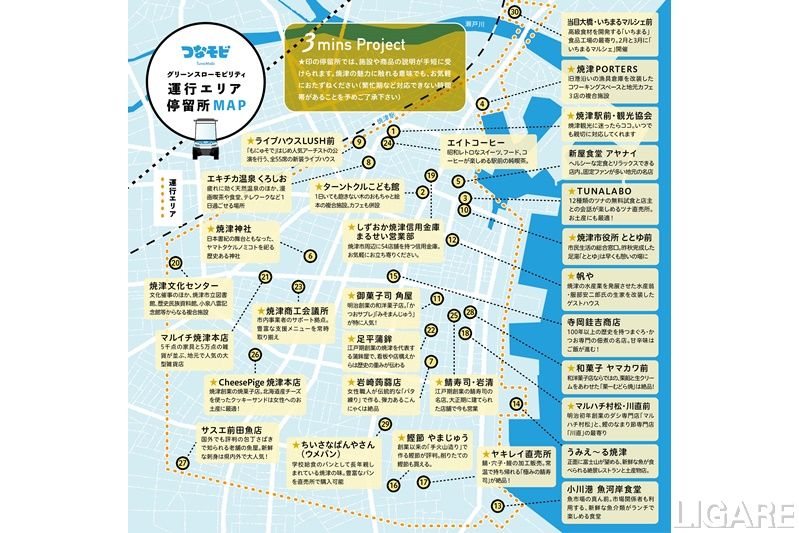さらに、今回の実験では、予約や決済を焼津市LINEの専用ボタンから直接可能となる。料金は乗り放題制となっており、大人が1日600円、小学生~高校生まで子供料金で1日300円だ。合計30カ所の停留所では、市内外の利用者を対象とした40回近い交流イベントを企画・実施するという。ほかにも、停留所となる施設や商品の説明を店主等から聞くことができる「3 minutes Project」を通じて、市内外の方に焼津の魅力を伝える取り組みも行う予定だ。