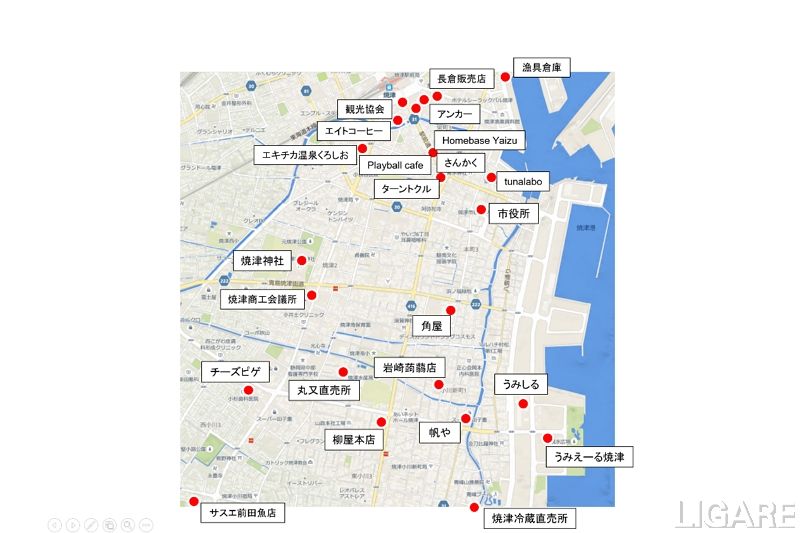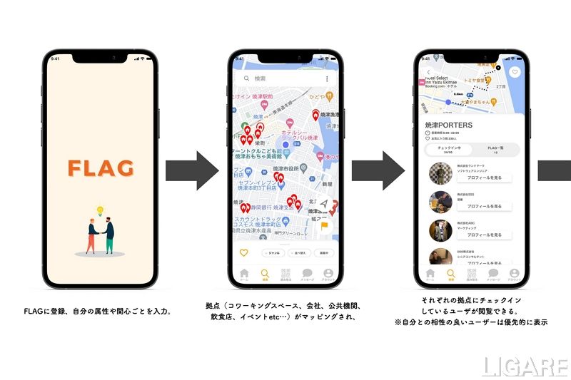 同実証の目的は、ビジネスマッチングアプリ「FLAG」を活用した人材交流目的での移動需要の検証だ。焼津市の協力のもと、焼津駅南口3キロ圏内のコワーキングスペース・飲食店・観光施設・直売所などの拠点をつなぐモビリティサービスを提供する。