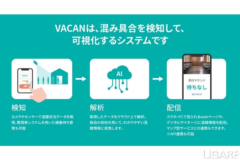 具体的には、サイネージや専用Webページを活用し、タクシードライバーが同エリアのリアルタイムの空き状況を簡単に確認できるようにすることで、無駄のない効率的な配車オペレーションの実現を目指す。混雑状況の検知・配信は、リアルタイム空き情報配信プラットフォーム「VACAN(バカン)」を活用する。