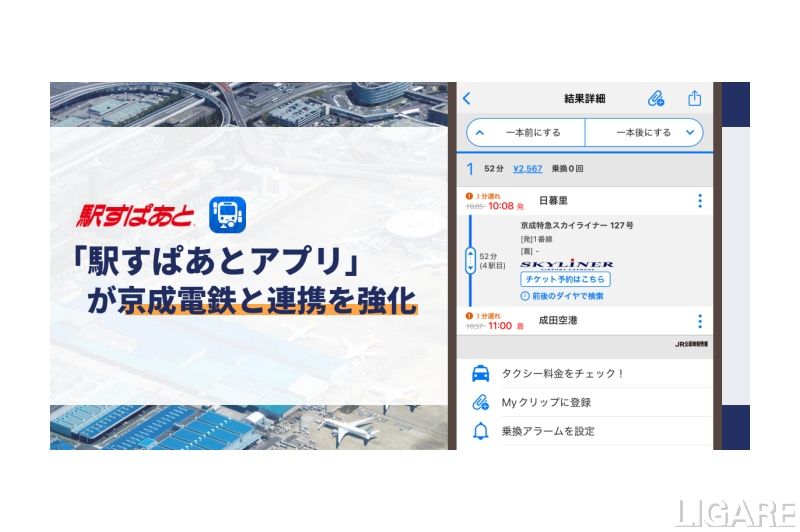 ヴァル研究所は6月30日、同社提供の「駅すぱあとアプリ(iOS版/Android版)」で京成電鉄のリアルタイムな遅延情報の提供とスカイライナーの公式サイトとの連携開始を発表した。
