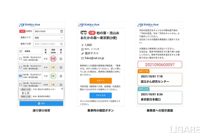 利用者は、スマートフォンやパソコンのウェブブラウザから運行便の検索・予約を行う。乗車時にスマートフォンで予約画面を提示することで、乗務員による乗車を確認できる。予約から乗車までの一連のプロセスに利用者のスマートフォンを活用するため、バス車両内に新たなIT機器を積み込む必要がない。そのため、容易に導入・運用開始が可能だ。