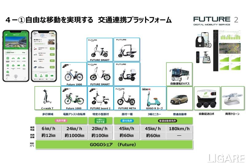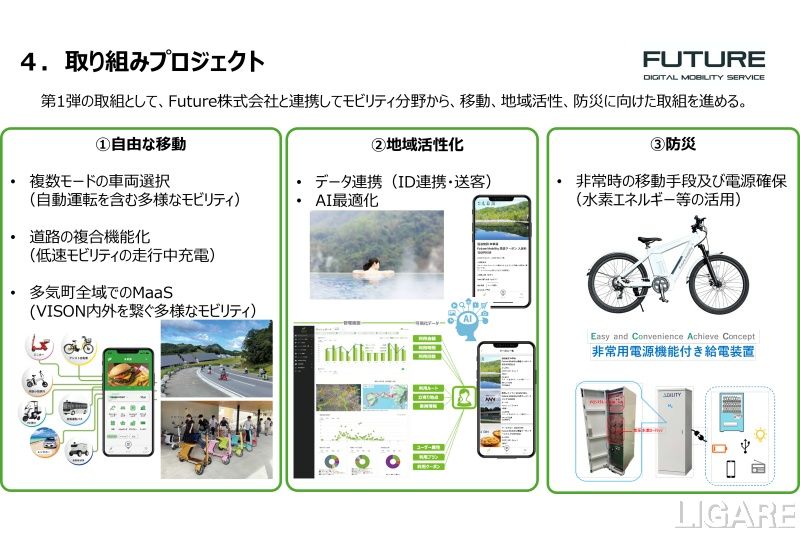 同プロジェクトの目的は、多気町および商業リゾート施設「VISON」を実証フィールドとして、国内外の企業やスタートアップが持つモビリティ、観光、防災、医療・福祉などの先端技術を実装。新たな価値創出を図り、多気町・VISONを“日本版シリコンバレー”とすることだ。第一弾の取り組みとして、Future社と連携してモビリティ分野から、移動・地域活性・防災に向けた取り組みを進めるという。具体的には、交通連携プラットフォーム、地域活性化を実現するプラットフォーム、水素自転車・水素非常用給電装置(防災機能の強化)、宇宙モビリティの実現に向けたプラットフォームを推進する。交通連携プラットフォームでは、自動運転車両を含む複数のモビリティの貸出サービスや自動運転をはじめとする多様なモビリティを1つのアプリで利用できるシステム構築を行うとのことだ。