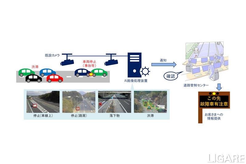 今回の画像処理システムは、高速道路上に設置されている既設カメラ映像を「AI画像処理装置」に接続して行う。車両停止、落下物、渋滞を検知した場合は、道路管制センターのスタッフに通知するという流れだ。
