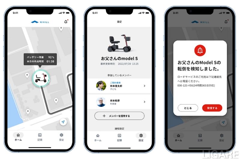 「WHILL Family Service」では、アプリ上でバッテリー残量や位置情報などの機体情報を確認でき、日々の外出履歴が自動で記録される。一連の情報は、本人だけでなく家族とも共有できる。万が一機体が転倒してしまった場合などの安全に関わる通知設定も可能で、もしもの際はいち早く家族に連絡が届く。なお、WHILL社は、今後近距離モビリティWHILLと関連サービスの展開を通じ、「すべての人の移動を楽しくスマートにする」ことを目指すと述べている。