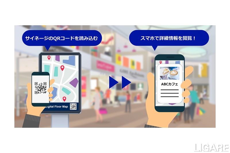 また、同サービスでは、スマートフォン連携機能を活用し、デジタルサイネージからスマートフォンで閲覧できるデジタルフロアマップに誘導する。これにより、顧客接点を増やし、非常時だけでなく日常における人手不足の解消や回遊性の向上を目指す。