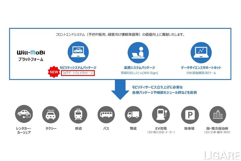 「Will MoBi プラットフォーム」は、モビリティに特化したDX推進基盤だ。今回提供開始する新機能「IoT ゲートウェイパッケージ」は、「カーシェアリングシステム」の提供で培ってきた車両データ取得技術や車両制御技術の知見を生かしたEV車両対応の車両データ収集・管理基盤だ。