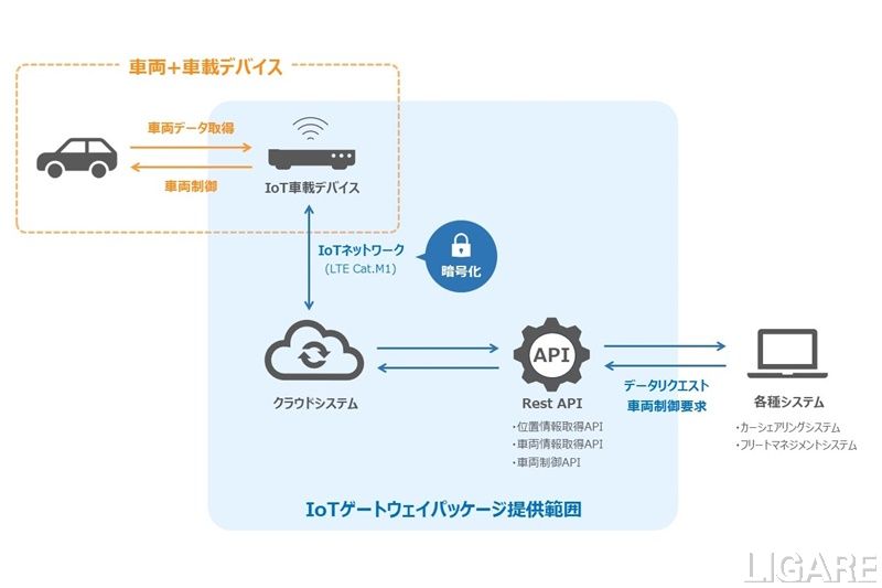 また、同機能では、車両から車載デバイスを通じて燃油残量や総走行距離、車速、GPSの緯度・経度情報のほか、バッテリー残量(SOC)やバッテリー状態(SOH)、充電状態などEV特有のデータも取得できる。データは長距離通信に最適なIoTネットワーク通信を用いているという。さらに、サーバーと車載デバイス間のデータ連携は暗号化しセキュリティレベルを向上させ、Rest APIによって事業者からのデータリクエストに対応する。
