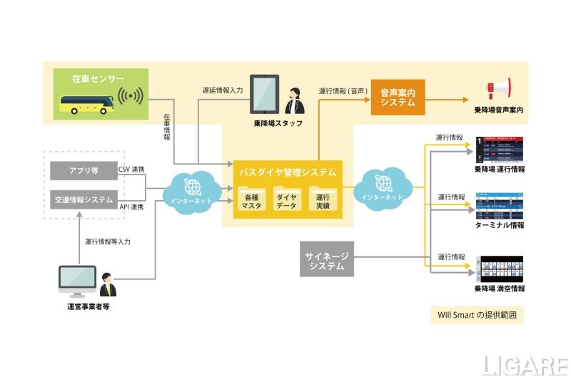 Will Smartのバスターミナル向け統合管理システムは、乗り場/ダイヤの登録および運行状況(変更、遅延、運休等)をクラウドシステムで管理し、運行情報を西エントランス広場入口とバス乗降場のサイネージシステムと連携する。また、在車センサーと連携することで各乗り場の満空情報を検知。乗降場スタッフが携行するタブレット端末での各発着場所の満空情報の確認およびタブレット端末を利用した遅延情報の入力や音声案内をリモートで操作できる仕組みを提供する。