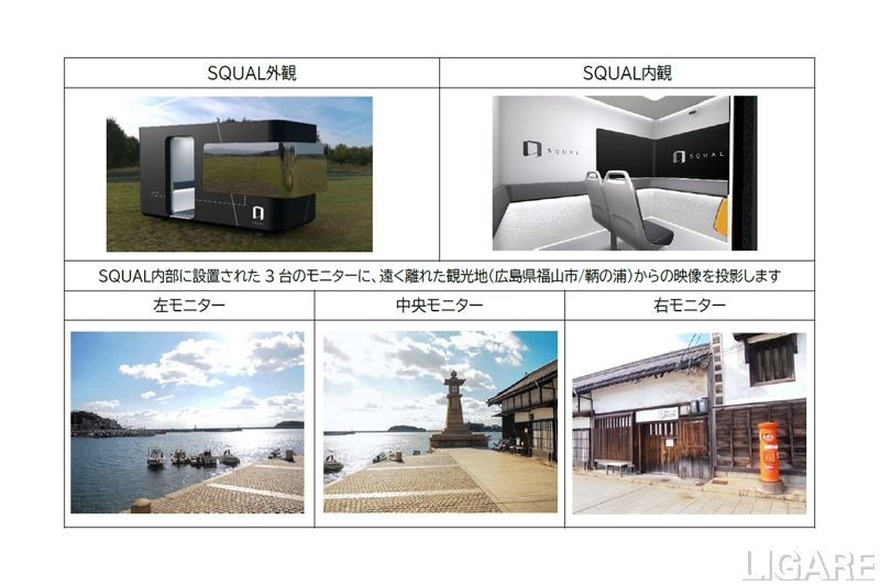 「車室空間での遠隔地とリアルタイムコミュニケーションが可能なオンラインツアー」では、 車室空間コンセプト「SQUAL(スクォール)」を使用する。広島県福山市/鞆の浦とモリコロパークを5Gで接続し、車両内の3面ディスプレイを用いて臨場感と没入感のあるオンラインツアーの実証を行う。