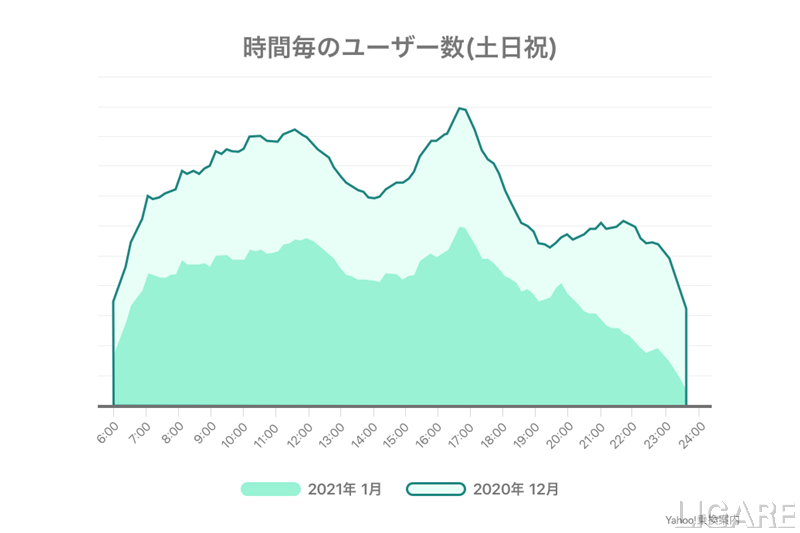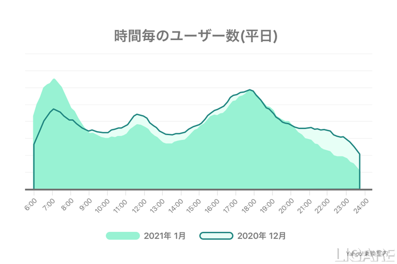 「Yahoo!乗換案内」アプリ(iOS版、Android版)で目的地を設定してルート検索するごとに1カウントとして集計し、集計期間の平日、土日祝それぞれの平均値と比較対象期間の平日、土日祝それぞれの平均値を10分単位で比較。