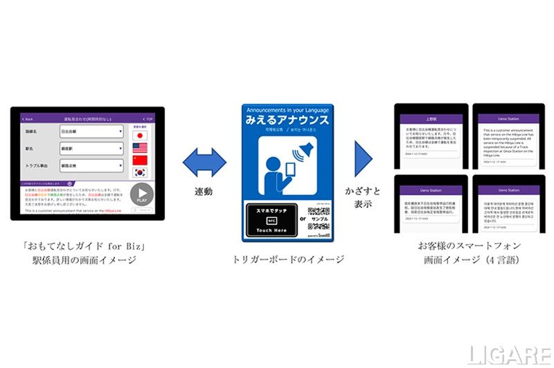 さらに、「おもてなしガイド for Biz」のアナウンスに連動して、ユーザーのスマートフォンへ文字表示させることができるトリガーボードを、7駅計46カ所に試験的に設置する。トリガーボードにユーザーのスマートフォンをかざすかQRコードを読み取ることで、その駅で放送された「おもてなしガイド for Biz」を活用したアナウンスの内容が文字で表示される。これにより、聴覚障がい者や訪日外国人旅行者にも視覚的に情報を伝えることができるようになる。ユーザーが専用のアプリをインストールせずとも、スマートフォンにアナウンスの内容を文字表示できるサービスの導入は、国内初になる。